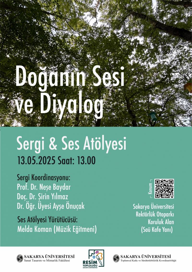 Sanat, doğa ve sesin iç içe geçtiği bu etkinlikte, STMF Resim Bölümü öğrencilerinin doğayla etkileşim kurarak tasarladığı mekâna özgü sanat çalışmaları sergileniyor. SAÜ Kafe yanında yer alan koruluk alanda düzenlenecek “Doğanın Sesi ve Diyalog” başlıklı sergi, izleyicileri sanatsal deneyim aracılığıyla doğa ile yeni bir ilişki ve diyalog ihtimaline davet ediyor.